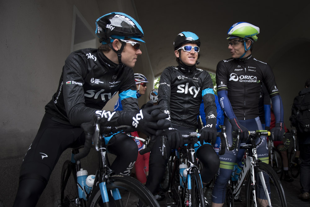 Noch ein Himmelfahrtskommando (Sky-Team, nome es omen, in der Mitte der spätere Rundfahrtgewinner Geraint Thomas) kurz vor dem Start der 1. Etappe der Bayernrundfahrt in Vilshofen