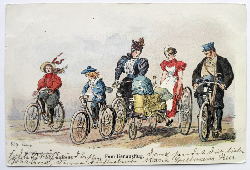 Das Radfahrmotiv stammt aus der Karlsruher Zeit Kleys, als der 35jährige noch nicht bekannt war und sich mit Aquarellen von Stadtansichten über Wasser zu halten versuchte. Das Motiv ist auch nicht weit her geholt, datiert doch die Erfindung des Fahrrads just 70 Jahre früher in diese Gegend als Drais von Schwetzingen nach Rheinau fuhr, also zwischen Karlsruhe, der Geburtsstadt von Kley und Heidelberg, dem Sitz der Hof-Kunsthandlung König welche die Kartenserie gedruckt hat.