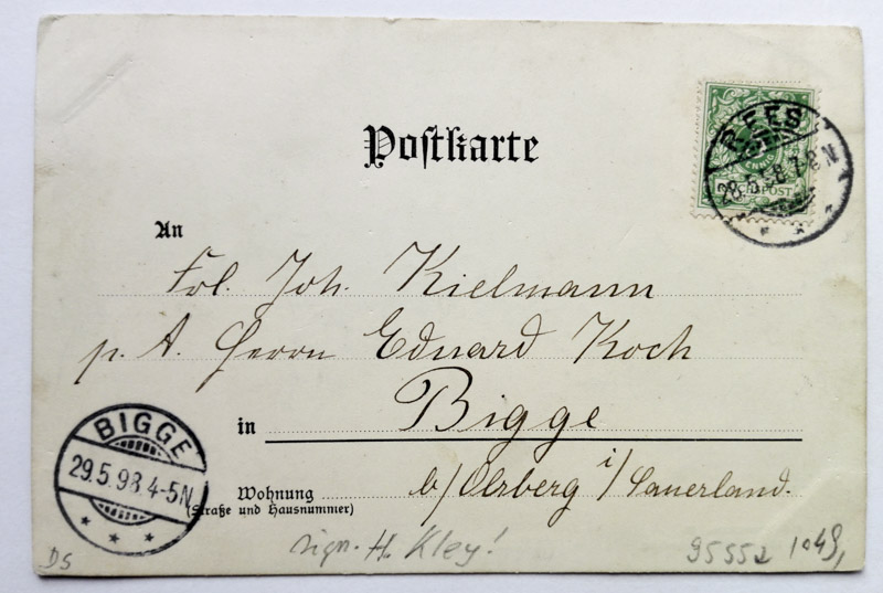 Hier ist ein Beispiel aus meinem Archiv von Fahrradpostkarten — eine Ansichtskarte an Frl. (Fräulein) Joh. (Johanna) Kielmann p.a. (per addresse) Herrn Eduard Kock in Bigge b/ (bei) Olsberg i/ (im) Sauerland. Abgesandt wurde die Karte von einer Frau Maria Spielmans aus Rees am Niederrhein, 150 km nördlich gelegen. Die Laufzeit betrug ein Tag, nämlich vom 28. auf den 29.5.1898, die Kosten beliefen sich auf 5 Pfennig Reichspost, ich entziffere “Frdl. (Freundlichen) Gruß und besten Dank sendet dir, liebe Johanna, deine dich liebende (?) Maria Spielmans. Rees.”