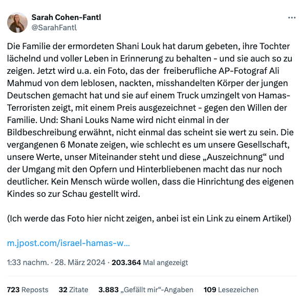 heisst requiescat in pace – Ruhe in Frieden. Wie verroht muss man sein, wenn man einen AP Fotografen auch noch dafür auszeichnet, daß er das Bild der toten Shani Louk veröffentlicht hat?