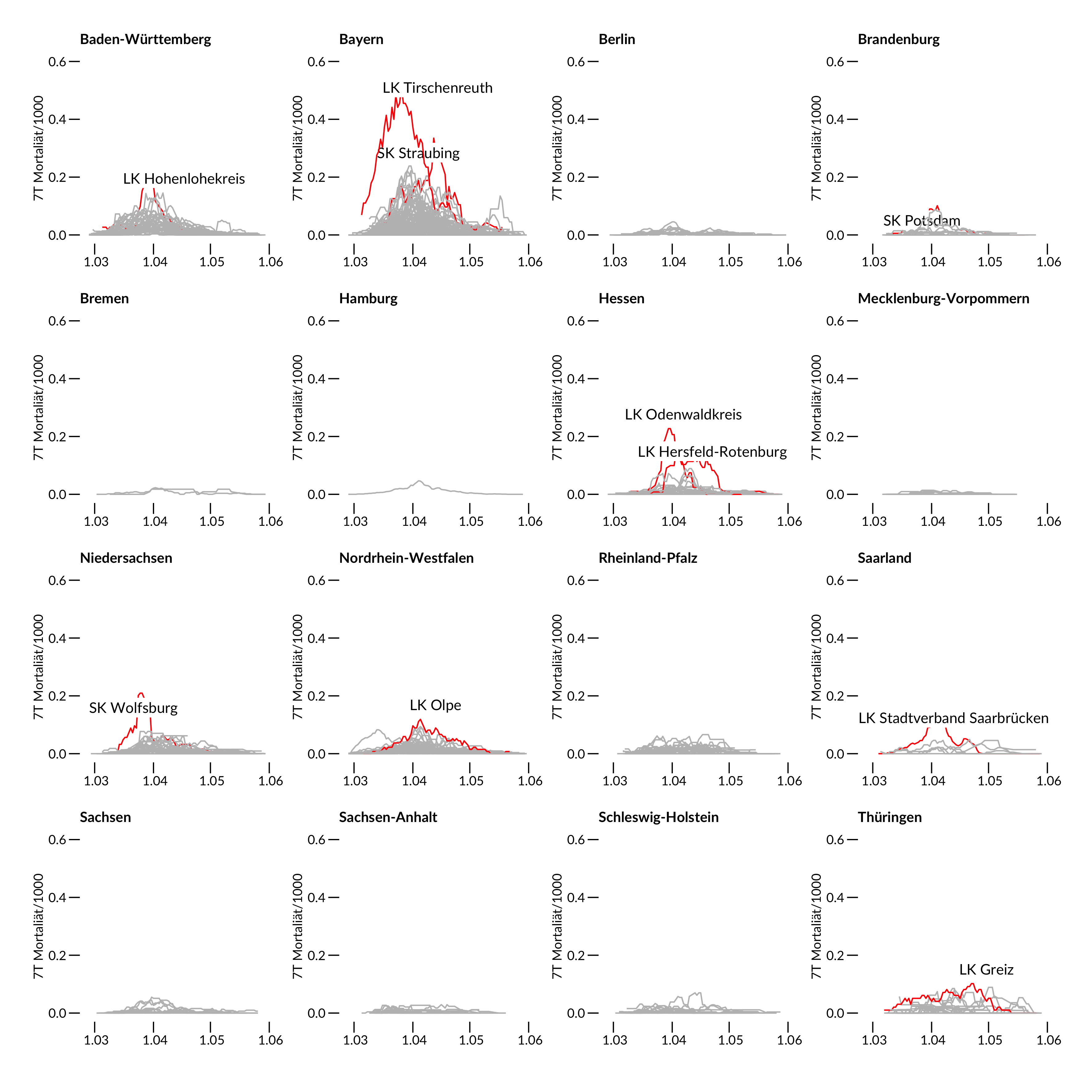 Mortalitätskurven (rot) definiert als kumulative Sterblichkeit innerhalb eines 7 Tage Zeitfensters um den Indextag bezogen auf 1000 Einwohner des jeweiligen Land-/Stadtkreises. 412 Kreise wurden dafür ausgewertet. Rot zeigt die jeweiligen Spitzenreiter des Bundeslandes an. Datenstand: RKI 4.6.2020.