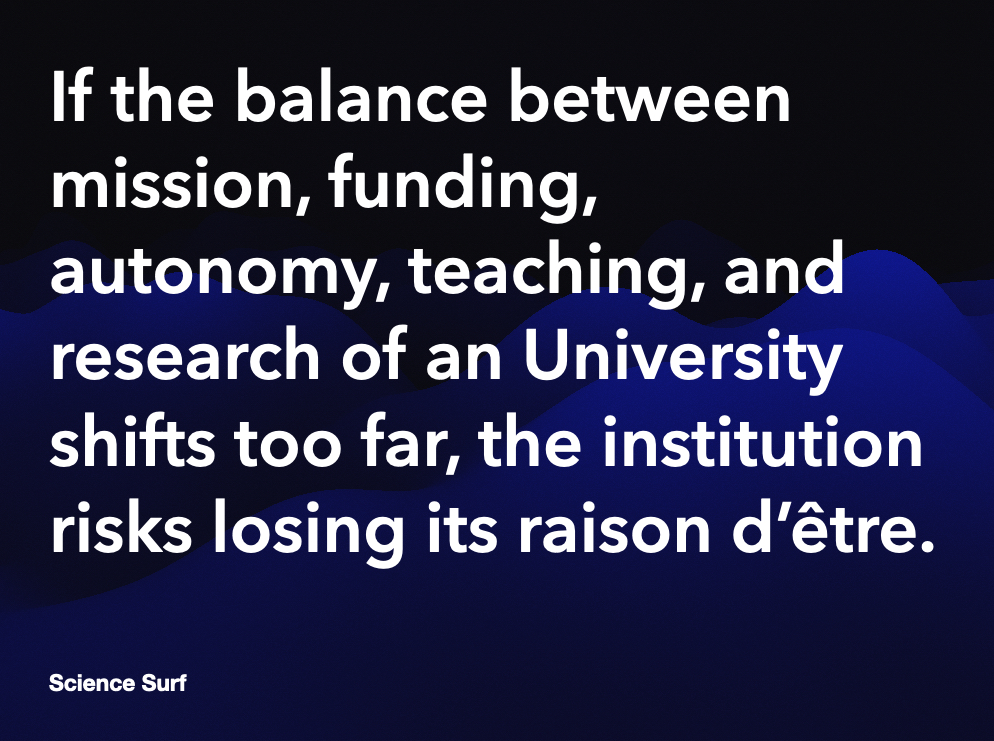 The model’s historical origin also illuminate why modern universities may be in trouble: if the balance between mission, funding, autonomy, teaching, and research shifts too far, the institution risks losing its raison d’être. All the financial and structural pressures that force institutions to prioritise revenue, prestige, cost-cutting and global competition rather than education. In addition we have a legitimacy crisis, where universities are no longer seen as the unique centres of knowledge creation and public good—they compete instead with other knowledge platforms and feel more like businesses.