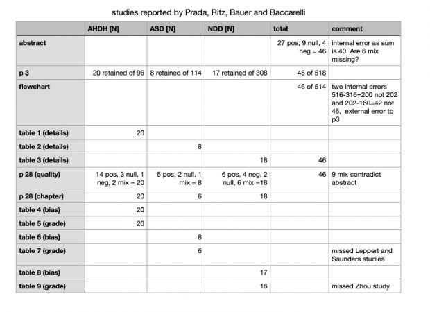 Unfortunately I am already stuck at the abstract. It says that 27 positive, 9 null and 4 negative studies were included (in total 40) but continues with 46 studies. The included chart has even two more internal contradictions that can be found immediately. Can you find them? Riddle solution is in the next table.
