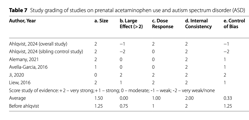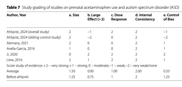 So the “who” question can be easily answered – the two authors with the lowest qualification (AB and DP) assigned the scores while there was no expert in pharmacoepidemiology or anyone with more than casual experience in meta-analysis or in autism research. Even the “why” question could be answered on the fly. We can therefore move on to the more important “what” question in this “rigorous review”.