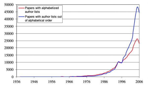 Fig. 4 Trends in author list alphabetization in computer science papers (data gathered from the DBLP Computer Science Bibliography) by Solomon 2009