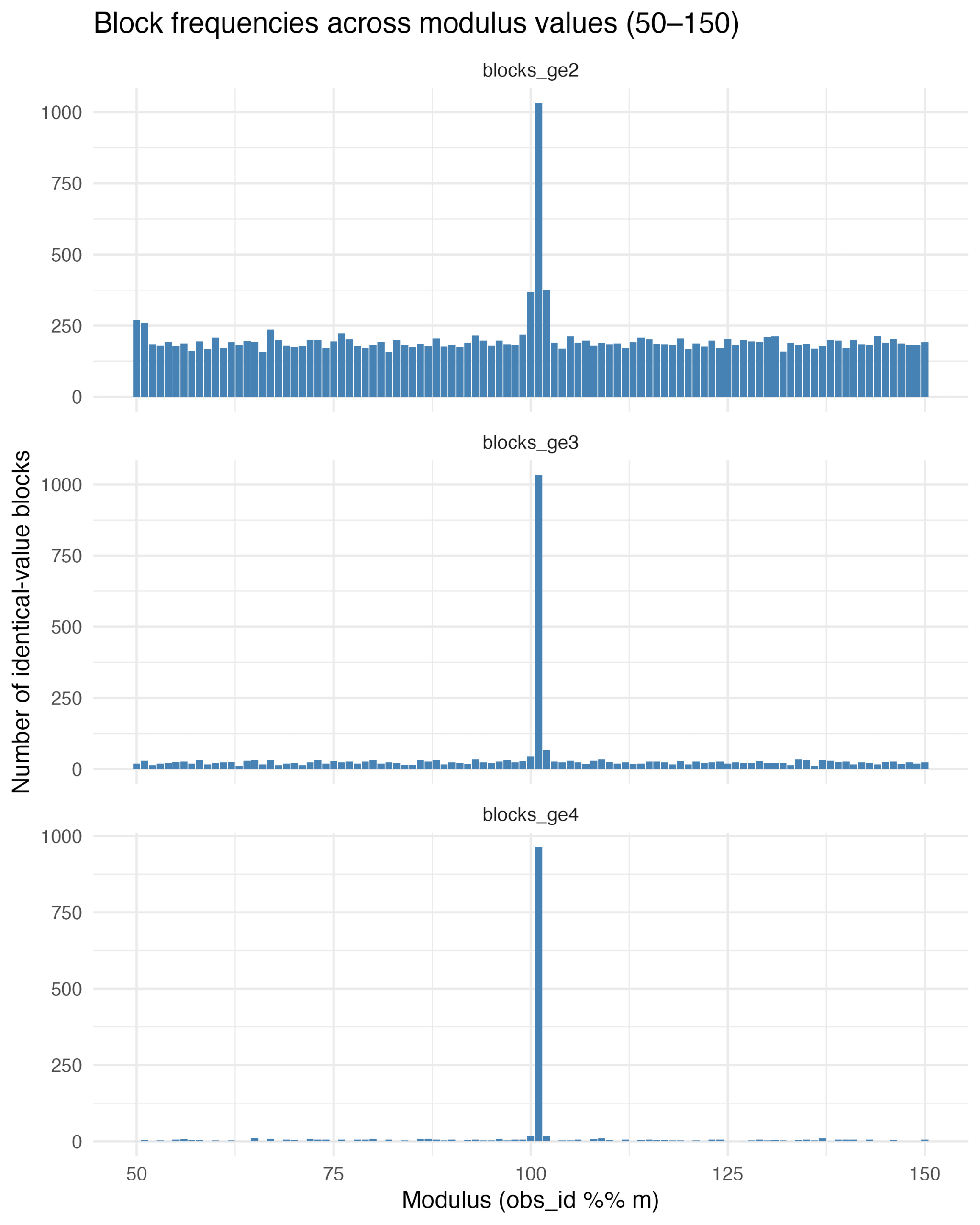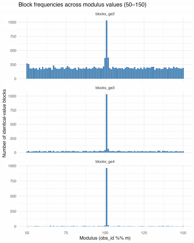 On the next day, I thought of a strategy to find the exact repetition numbers. Why not looping over mod 50 through 150 and just count the number of identical blocks? This is very informative – blocks of size 2, size 3 and 4 or greater show an exact maximum at modulus 101.