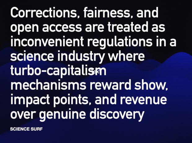 Thus, the science publishing industry reproduces the same pathologies seen in unregulated capitalism: profit before accountability, show before truth, and career before fairness. In this turbo-capitalist model, we have learned the price of everything — but the value of nothing.. To restore science to its purpose — the open pursuit of truth — it is not enough to call for open access. The entire system must be rebalanced away from speculative prestige and back toward collective responsibility, transparency, and genuine public knowledge.