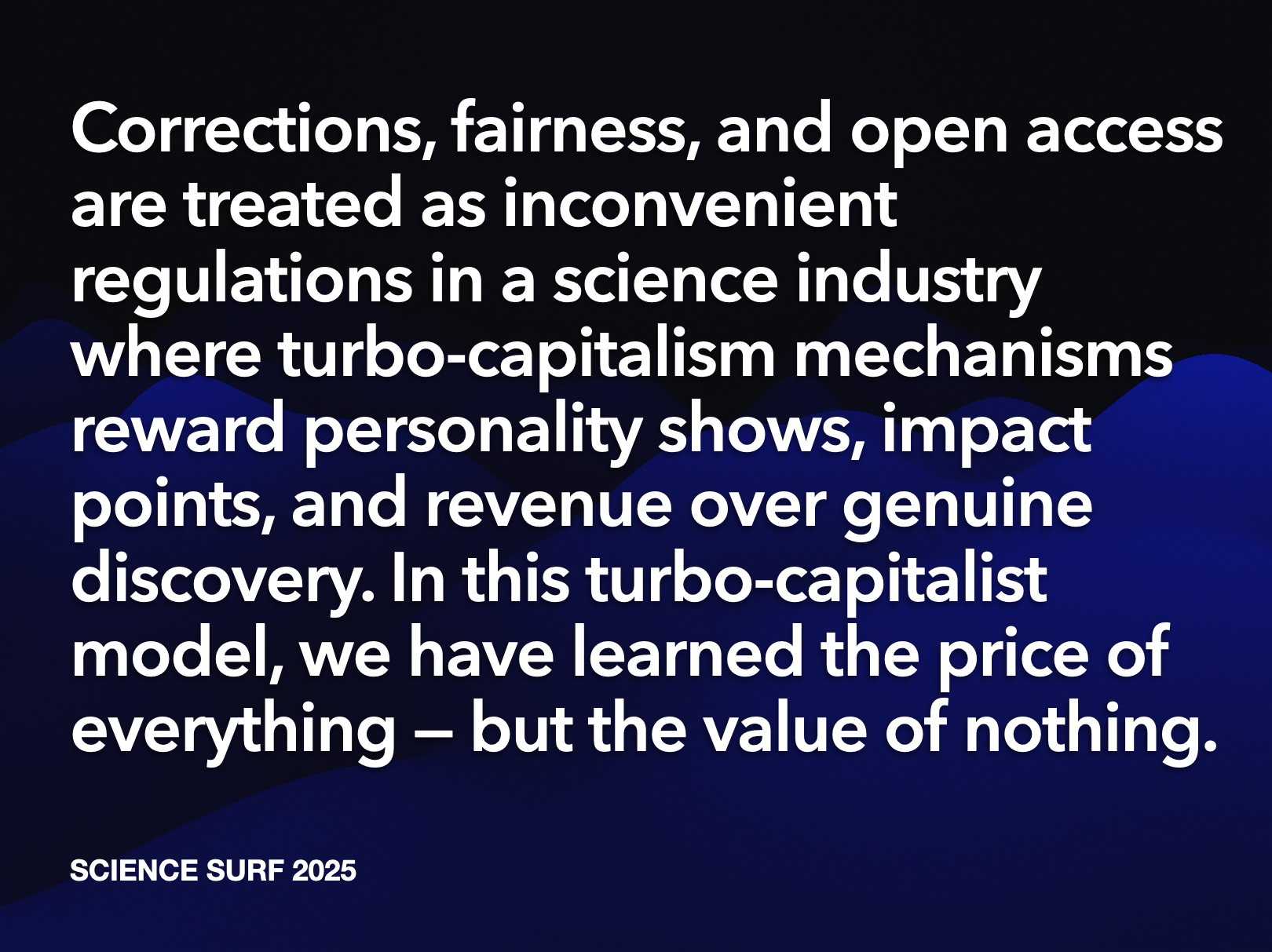 Thus, the science publishing industry reproduces the same pathologies seen in unregulated capitalism: profit before accountability, personality show before truth, and career before fairness. In this turbo-capitalist model, we have learned the price of everything — but the value of nothing. To restore science to its purpose — the open pursuit of truth — it is not enough to call for open access. The entire system must be rebalanced away from speculative prestige and back toward collective responsibility, transparency, and genuine public knowledge.